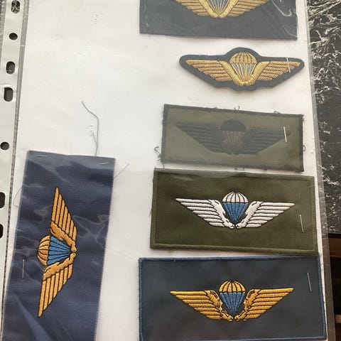 Dansk militært faldskærmsvinge, guldfarvet metal og blå detalje.