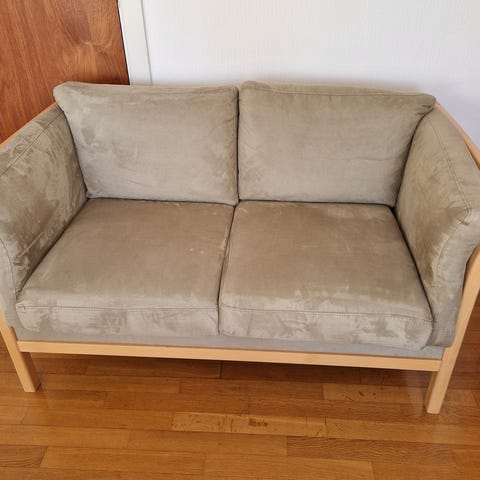 Skønne sofaer som har været brugt i mange år. Er stadig super behagelige og i ok stand. Selve stoffet fremstår pænt, men man kan godt se at den har været brugt.