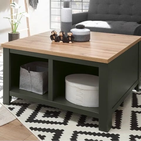 Kvadratisk solidt sofabord med hylde i hvidt træ. Mål er cirka, da jeg ikke er i sommerhuset. Giv et bud. Skal afhentes.