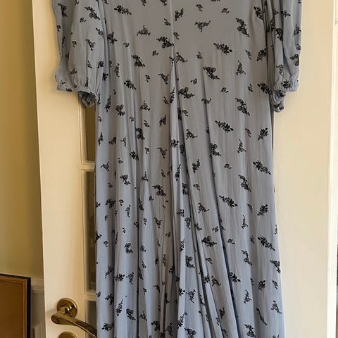 Smuk lyseblå Ganni-kjole, som man binder i taljen. Se sidste billede for rigtig farve og mønster. Brugt og vasket en enkelt gang.