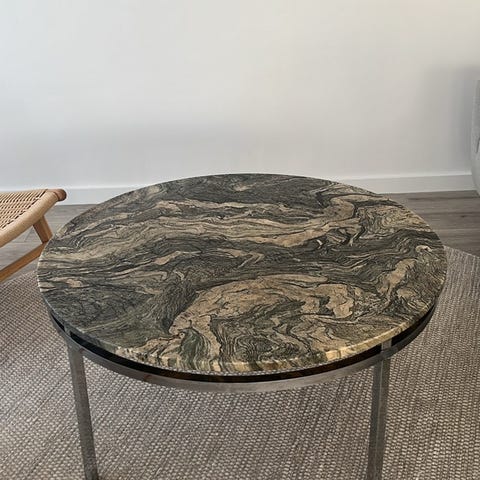 Smukt sofabord fra Louise Roe, lys marmor med stålunderstel. Står fast og solidt. Ingen hakker eller skår. the Jewel Coffee Table.