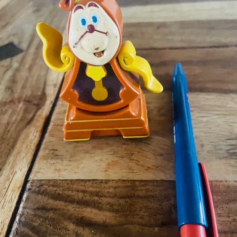 McDonald's legetøjsbil i pink med en figur af en karakter med rødt hår og blå briller. Bilen er lavet af plastik og har hjul, der kan rulle. Legetøjet er designet til børn og har detaljer som McDonald's logo på fronten.