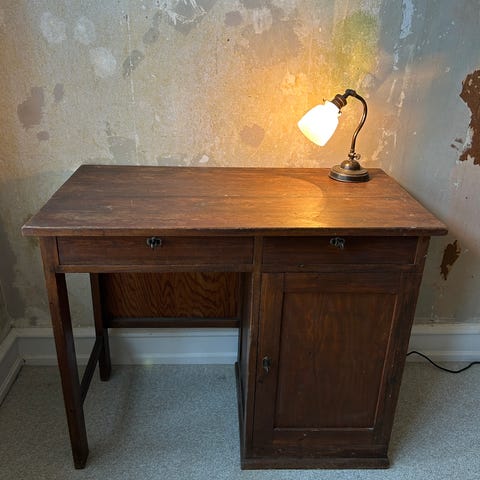 Mindre skrivebord i egetræ med 3 skuffer og en stor bordplade. Skrivebordet har en klassisk konstruktion med synlige samlinger og et enkelt design. Skrivebordet er lakeret. Velegnet til kontor- eller hjemmearbejde. Længde 1400, B 70 , H 73 og skuffe H 10 cm