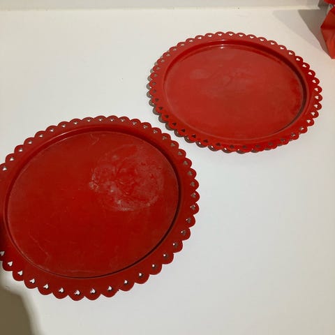 Gamle runde fade, Til feks adventskrans. To i tin koster 200pr stk. de andre i messing ø 27 og pletsølv måler 29,5 150kr pr stk.