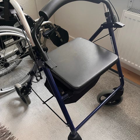 Rollator med integreret kurv og sæde, designet til at støtte mobilitet og give mulighed for hvil under brug. Købt i Harald Nyborg. Har været brugt, men fungerer stadig som den skal.