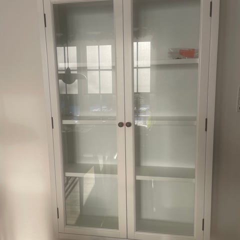 5 fags hængevitrine i massiv egetræ, mat lak, med glaslåger og glashylder, ophængs lister monteret bag på