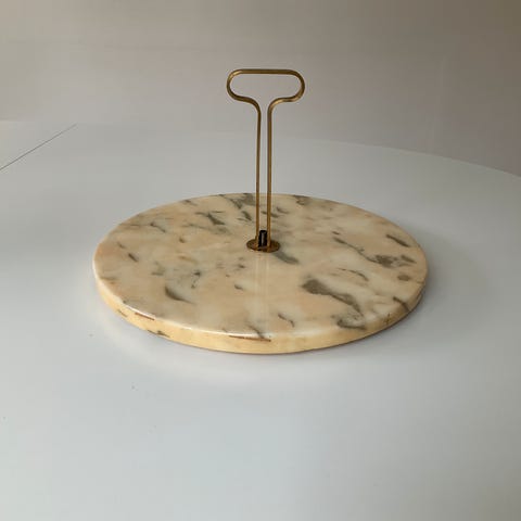 Marmor fad med en diameter på 27 cm monteret på et metalstativ. Fadet har en rund form og en hvid farve med naturlige marmormønstre. Stativet har tre ben med kugleformede fødder.