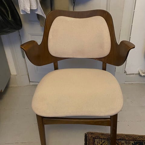 Hans Olsen armstol i teaktræ. Projekt der er opgivet. Stolen er i god stand, men mangler betræk. Kan leveres I Storkøbenhavn for kr 50,-.
