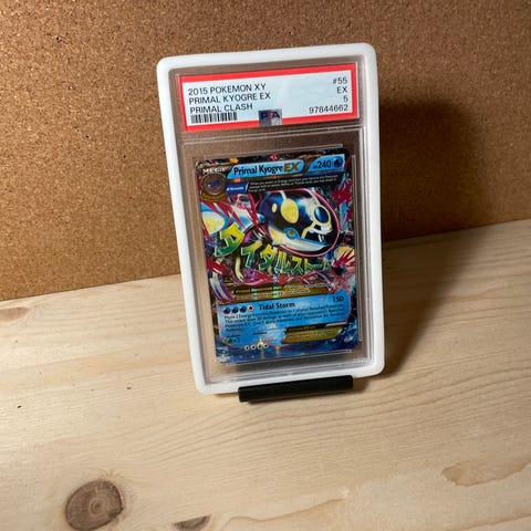 Pokémon Primal Kyogre EX samlekort med farverigt holografisk design. Kortet viser Pokémon-figuren Primal Kyogre med angivelse af angreb og evner. Kortets bagside har standard Pokémon-logoet. Velegnet til samling og spil.