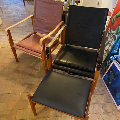Kaare Klint Safari stol i sort læder. Til renovering da to af stropperne bl.a er knækket.