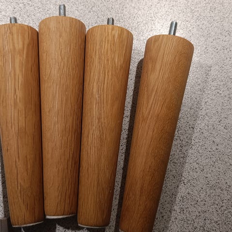 10 cm Egetræs ben 4 stk, passer også til jysk senge . Helt nye.. incl plastik skive
