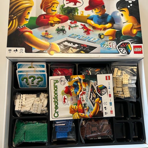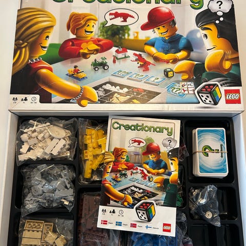 LEGO Creationary brætspil/bordspil. Der er en god vejledning på, Sprog: Tysk, Engelsk, Fransk, Italiensk. Spillet indeholder forskellige byggedele og kort til kreativ leg og konstruktion. Egnet til brug af børn og familier til underholdning og kreativ aktivitet. Alder fra 7 år og op. 3-8 spillere kan deltage. En spillerunde vil typisk tage 30-60 minutter.