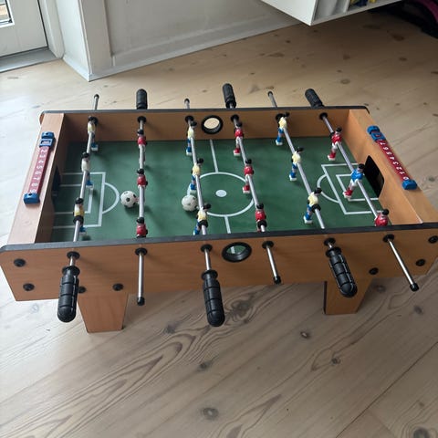 Bordfodboldspil i træ med målene cirka 45cm i længden og 30cm Spillet har figurer i to farver, rød og gul, monteret på metalstænger til at styre spillerne. Egnet til bordbrug og mindre spillearealer.