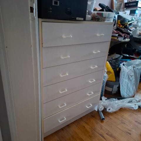 Kommode i hvid med flere skuffer til opbevaring. Fremstillet i træmateriale, velegnet til opbevaring af mindre genstande i hjemmet.