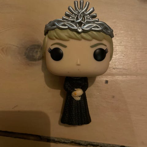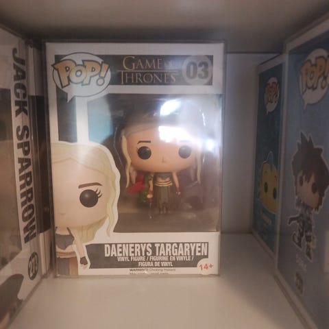 Funko Pop figur af Daenerys Targaryen med en lille drage. Figuren er lavet i plast og har detaljeret design med blondt hår og grøn kjole. Figuren er cirka håndstørrelse og velegnet til samling eller dekoration.