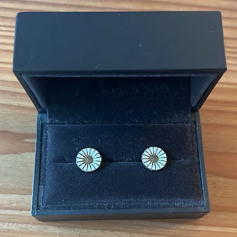 Store Georg Jensen Marguerit Daisy øreringe i sølv med hvid emalje. Ø33 mm. Meget god stand, bortset fra en meget lille ufuldkommenhed i emaljen på ét sted (se de sidste 2 billeder).
