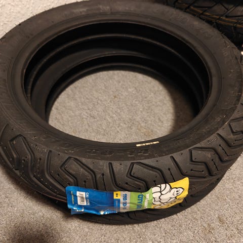 Dækket et 100/90-10 helårs Duro DM-1015 (61J) TL dæk ,det har været brugt en gang da der er stor rullemodstand i det dæk og det er der ikke i dem jeg kører med nu !