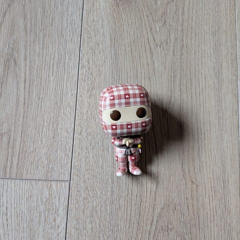 Funko Pop samlerfigur med et ternet mønster i røde og hvide farver samt små hjerter. Figuren har store sorte øjne og er lavet af plastik. Den er velegnet til samling eller dekoration.