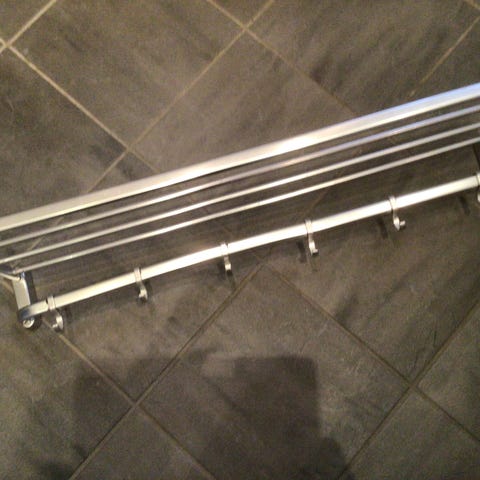 Mørkegrå hattehylde med sort bøjlestang i kraftige rør.