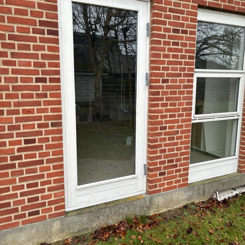 Terrassedør med glas. hvid ramme, velegnet til udendørs adgang.