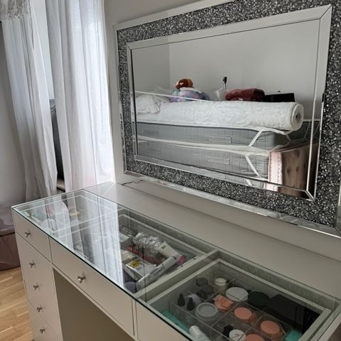 Makeupbordet er helt nyt og aldrig brugt – det står stadig i originale papkasser, præcis som da det blev købt. Du får altså et ubrugt kvalitetsmøbel til en markant lavere pris.