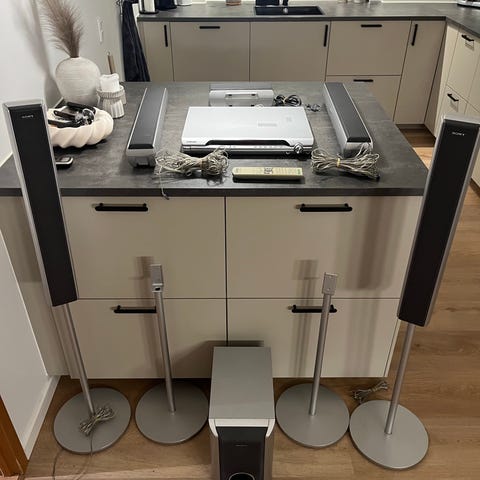Sony DAV-DZ870W DVD Home Theatre System med flere højttalere og subwoofer. Systemet inkluderer en DVD-afspiller og en central enhed med volumenknap. Designet til hjemmebiografbrug med mulighed for tilslutning af hovedtelefoner.
