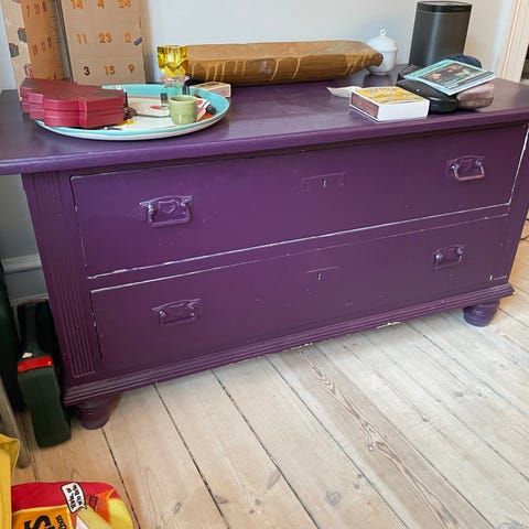 Fin kommode med tre skuffer hvor den ene skuffe mangler et greb. Trænger til en klat maling, hvis den skal stå helt skarpt, men også fin som den er. Står på Frederiksberg.