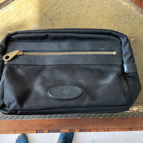 Elegant og tidløs Mulberry Wash Case i sort grained læder med kontrasterende brune kanter. Toilettasken kombinerer luksus og funktionalitet, perfekt til både rejse og daglig brug. Designet med et rummeligt hovedrum, lynlåslukning og diskret Mulberry-logo præget på fronten.
