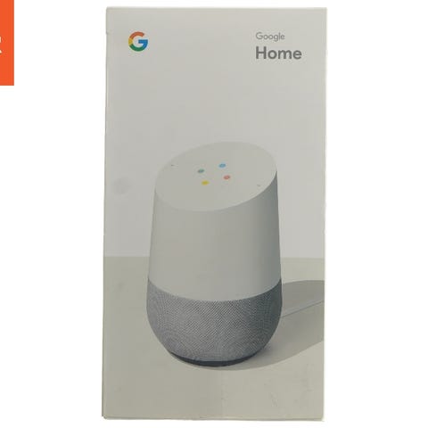 Google Nest Audio højttalere i grå farve. Sættet indeholder to højttalere med tilhørende strømadaptere. Designet til at levere lyd til hjemmebrug.