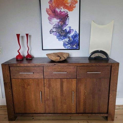 Kraftig og robust spisebordssæt med matchende skænk og 2 tillægsplader. Bordet måler 100X200/300 cm. Skænk måler 45X200 cm. 85 cm høj.