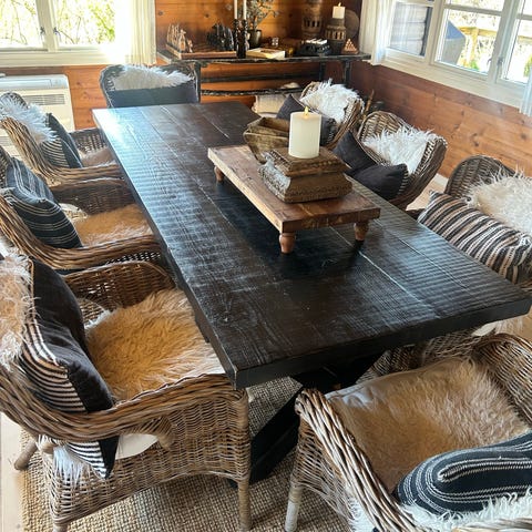 Spisebord med tilhørende stole, hvor bordpladen er i træ og stoler lavet i flet og træ der er 15 stk en med armlæn. Bordet har en mørk træoverflade og stole med høj ryg. Sættet er velegnet til spisestuebrug og kan rumme mange personer. Der kan sidde ca. 12 per om bordet. der er en stor ekstra plade til border så man kan ca. sidde 20 per.
