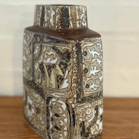 Bing & Grøndahl vase med brunt kant. Vasen har en lysegrå, sprækket overflade og er fremstillet i porcelæn. Den er produceret i Danmark og har et enkelt, klassisk design.