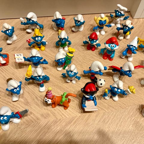 Smølfer Smølfefigurer samling bestående af forskellige figurer med forskellige accessories og positurer. Figurerne er små, blå med hvide hatte og forskellige tilbehør, der repræsenterer forskellige roller og aktiviteter.