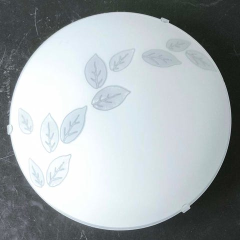 Loftlampe med fem hvide glasskærme i blomstret design. Lampen har en metalramme med en mørk finish og ophængskæde. Egnet til montering i stue eller spisestue for generel belysning.