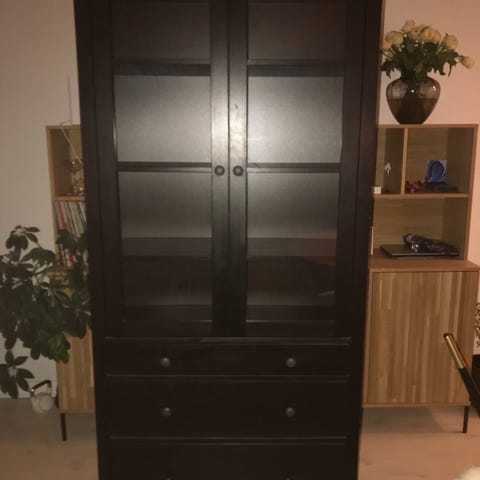 IKEA opbevaringsskab med tre glaslåger i sort. Skabet har hylder indvendigt til opbevaring. Materialet er træbaseret med glaslåger. Velegnet til opbevaring i hjemmet eller kontoret.