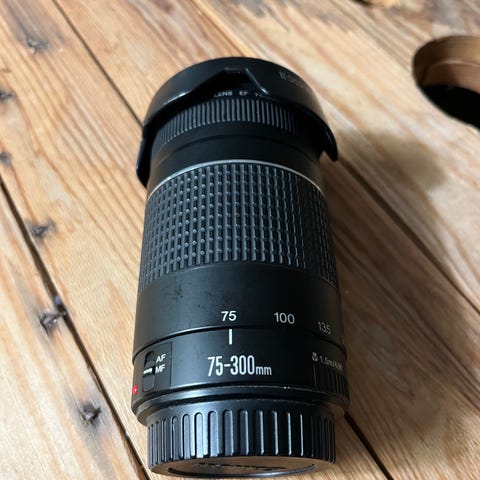 Canon EF 75-300mm teleobjektiv med zoomfunktion. Objektivet er designet til brug med Canon kameraer og har en brændvidde på 75-300mm, hvilket gør det egnet til fotografering af motiver på afstand.