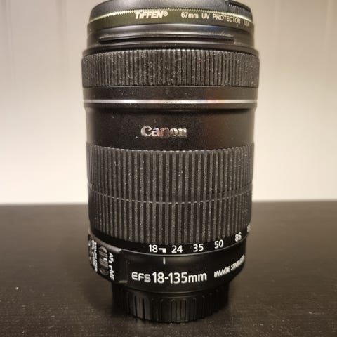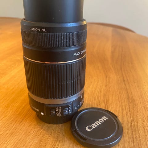 Canon EF-S 55-250mm kameraobjektiv med zoomfunktion og billedstabilisering. Objektivet er designet til brug med Canon-kameraer og har en brændvidde på 55-250mm.