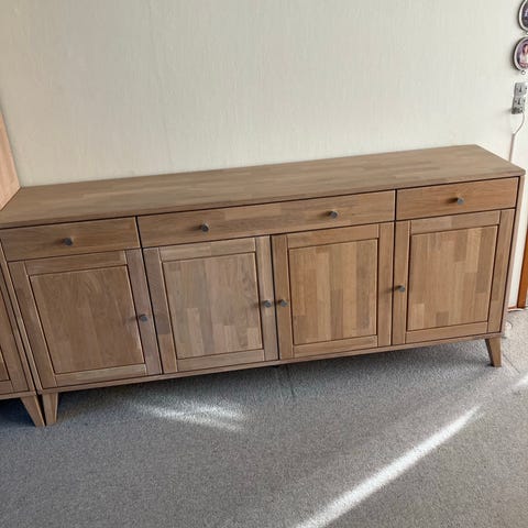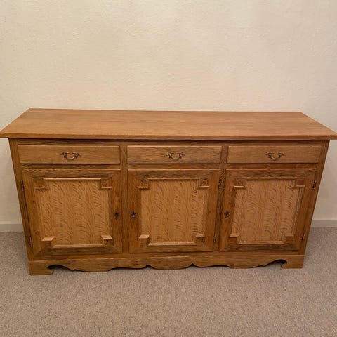 Meget fin skænk sælges pga. pladsmangel. Skuffer og indvendige hylde er i finer. Jeg tror rammen er massiv eg.
