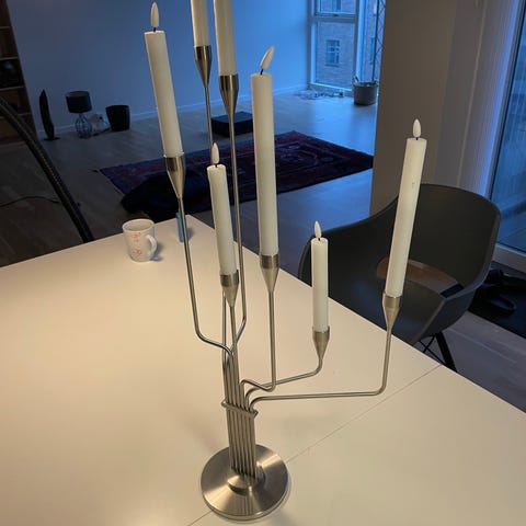 Lysestagen i rustfrit stål måler 63 cm i højden. Den har plads til 7 lys, som du kan placere på en ret linje eller dreje armene ud så de står forskudt.