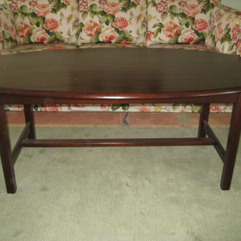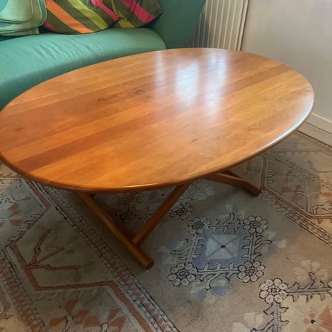 Sofabordet er ovalt og er massivt amerikansk stavlimet kirsebærtræ og fremstår med brugsspor.