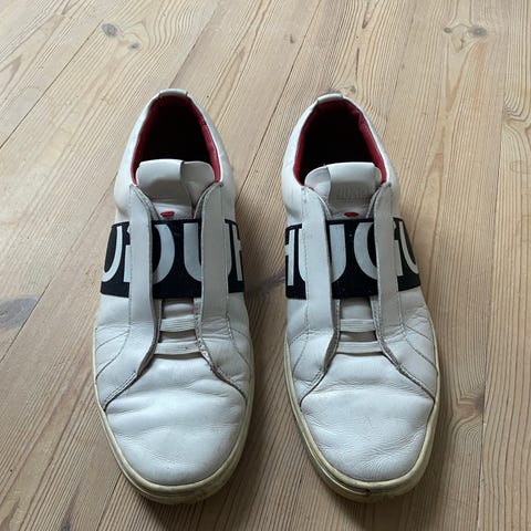 Boss sneakers i størrelse 45. Skoene er designet med en kombination af materialer i grå, sort og røde detaljer. Velegnede til hverdag og fritid.