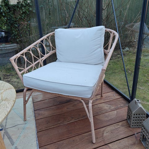 Sæt bestående af to fletstole med tilhørende hynder. Stolene har en naturlig fletstruktur og hynder med blomsterprint i grønne og beige nuancer. Egnet til brug indendørs eller på overdækkede udeområder.
