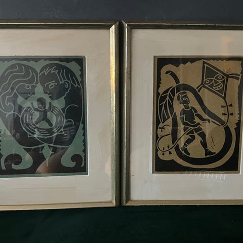 To tryk af Henry Heerup med digte af Sigfred Pedersen og Chr. Richardt på bagsiden af rammen. Heerup museet har identificeret dem og fortalt mig at de aldrig har set hverken tryk eller de oprindelige linoleumsnit, bortset fra i Hans Moestrups bog ”Henry Heerup – Det grafiske værk 1930-80” hvor de er medtaget.