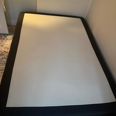 Sengen har en del skjolder og pletter, men er ikke forsøgt renset. Betrækket på topmadrassen kan tages af og vaskes. Skal selv bæres ned fra tredje sal.