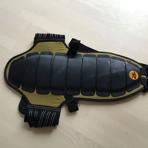 Dejligt at have under jakken så det ikke trækker ind :-) One size, mørkeblå og lyserød/lilla foer, med velcrolukning, selve kraven måler 8 cm, brugt men pæn og velholdt