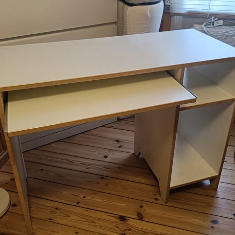 Mindre bord med sammenklappeligt stel af står og en hvid laminat bordplade.