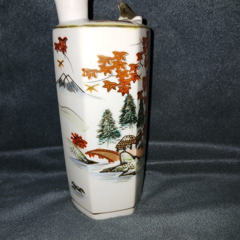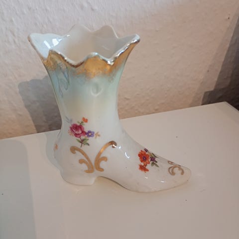vase i porcelæn med dekorative blomster- og fuglemotiver. Vasen har en firkantet form med guldkant og detaljer. Velegnet til blomsterdekoration og som dekorativ genstand. Vasen 14.5 høj 4.5 øverst lidt bredere nedad.
