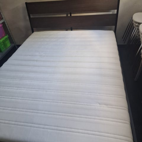 IKEA Hamarvik madras med hvid overflade og grå sider. Madrasen har quiltet mønster på siderne og er designet til at give komfort og støtte. Materialet er tekstil, og madrassen er egnet til brug på seng. Sælges inkl topmadras.