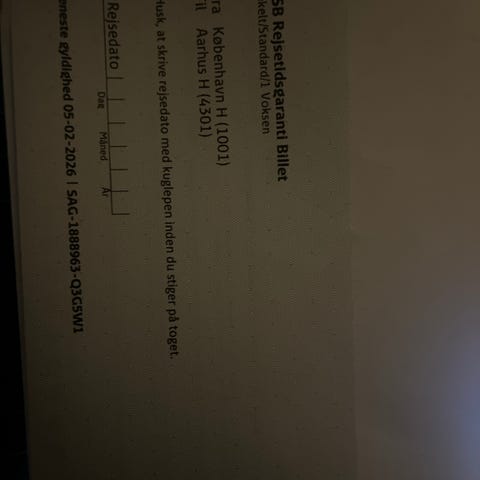 Billetten er en rejsegarantibillet, som jeg fik for en rejse med lang forsinkelse. Man kan selv vælge tidspunkt og skrive datoen på papirbilletten. Den gælder København H - Horsens. Jeg har egentlig selv planlagt en tur og købt en billet den anden vej, men jeg kan ikke komme afsted alligevel.