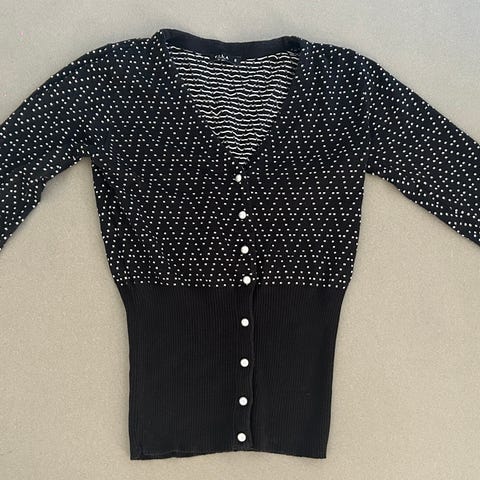 Sød sort cardigan med skinnende bindebånd og en lille hægte. Mærket er klippet ud, men det er viskose. Lille reparation, som dækkes af bindebåndet. Pæn stand. Dejlig blød. Str S, men passer også str M.